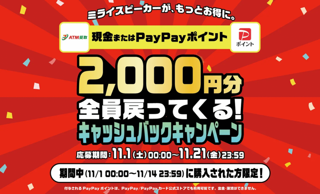 11月14日(金)までにミライスピーカー公式サイトから購入し、11月21日(金)までにキャッシュバックの申し込みをすると、現金またはPayPayで2,000円が戻ってきます。