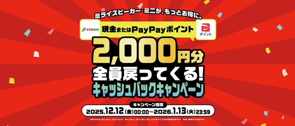 2025年12月12日(金)~2026年1月13日(火)までにミライスピーカー公式サイトから購入し、キャッシュバックの申し込みをすると、現金またはPayPayで2,000円が戻ってきます。